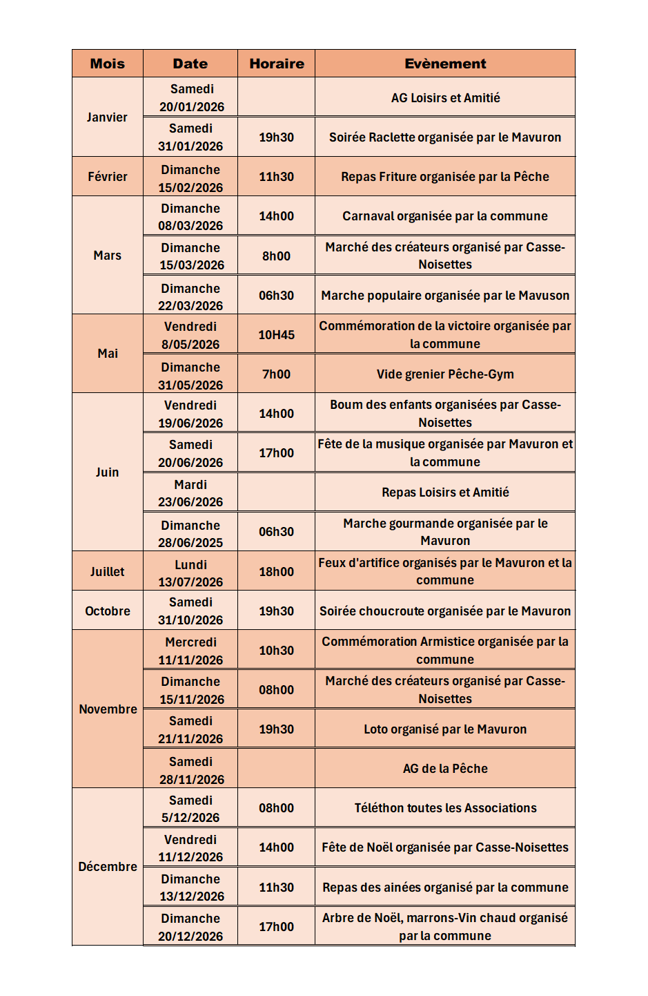 Calendrier prévisionnel évènements 2026 – Commune de Badevel